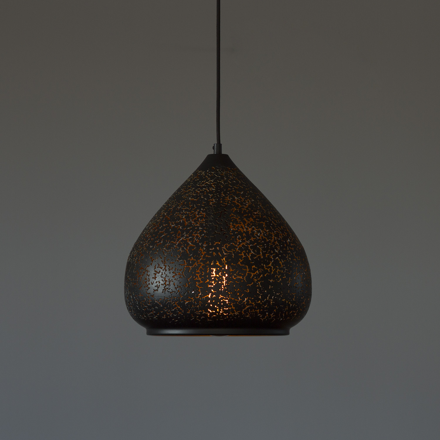 Його металева матова поверхня та візерункові прорізи створюють чарівну гру світла, наповнюючи простір теплими відблисками.