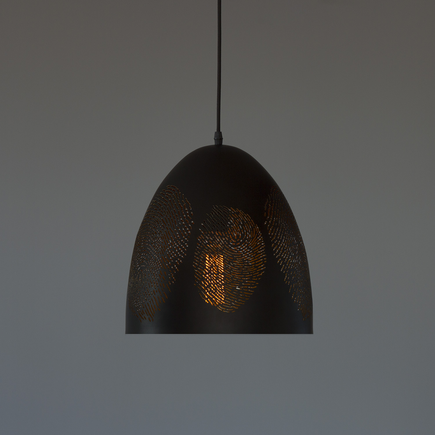 Його металева матова поверхня та візерункові прорізи створюють чарівну гру світла, наповнюючи простір теплими відблисками.