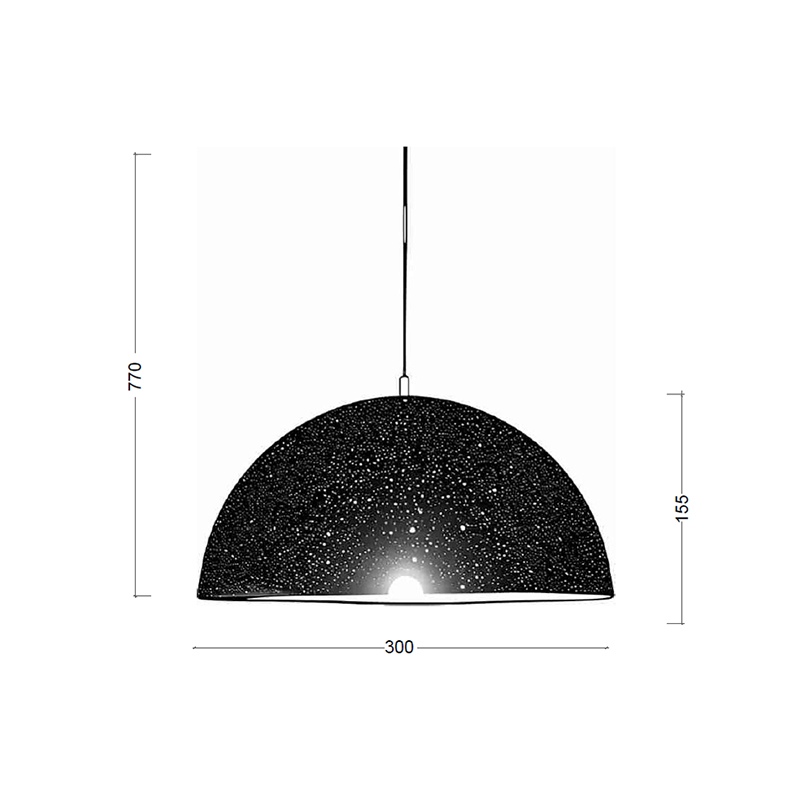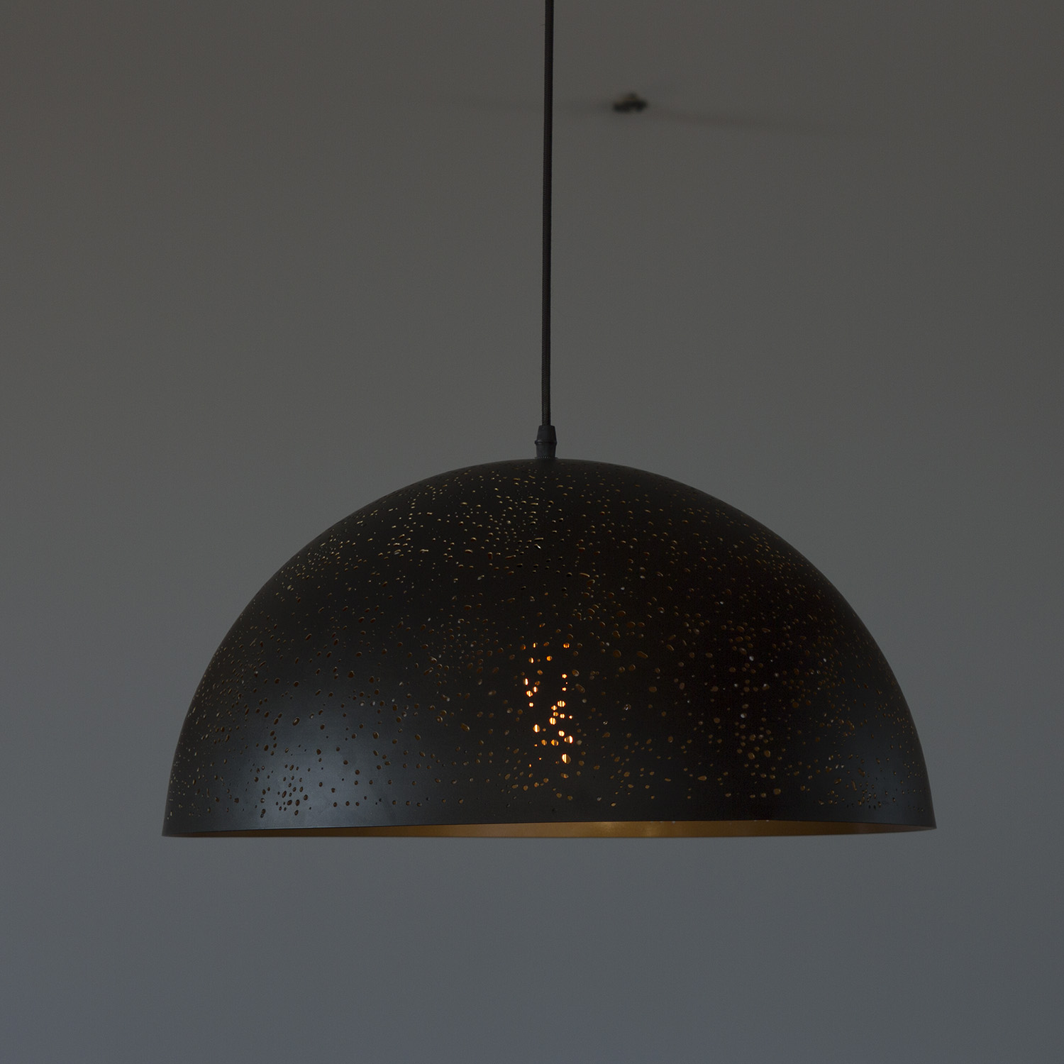 Його металева матова поверхня та візерункові прорізи створюють чарівну гру світла, наповнюючи простір теплими відблисками.