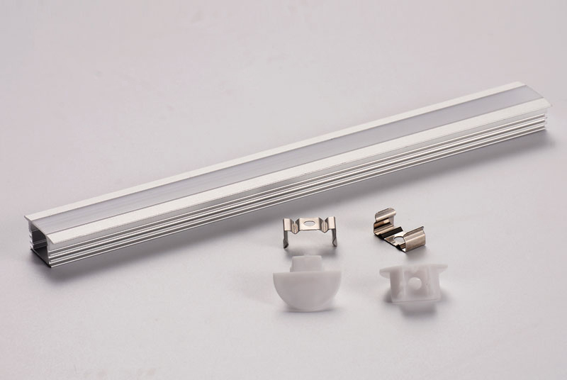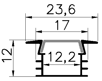 Алюмінієвий профіль вбудований із фланцем шириною 23,7мм для декоративного підсвічування для LED стрічки завширшки не більше 12мм. Розсіює світло на 120град. Йде в комплекті з екраном Opal, 2-мя заглушками і кріпильними ел-ми на 1м. Загальна довжина профілю 3м.