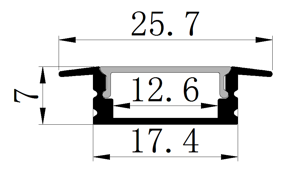 Алюмінієвий профіль вбудований із фланцем шириною 25,7мм для декоративного підсвічування для LED стрічки завширшки не більше 12мм. Розсіює світло на 120град. Йде в комплекті з екраном Opal, 2-мя заглушками і кріпильними ел-ми на 1м. Загальна довжина профілю 3м.