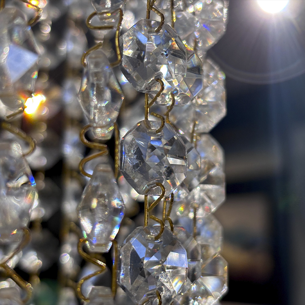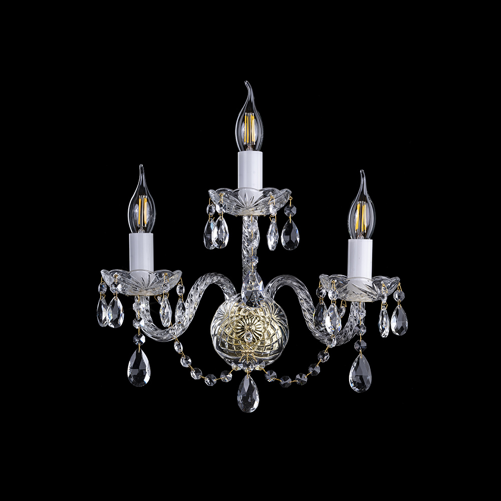 Вишуканий кришталевий настінний світильник додасть інтер'єру неповторного шарму та елегантності. М'яке світло, переливаючись через прозорі підвіски, створює атмосферу затишку і розкоші.